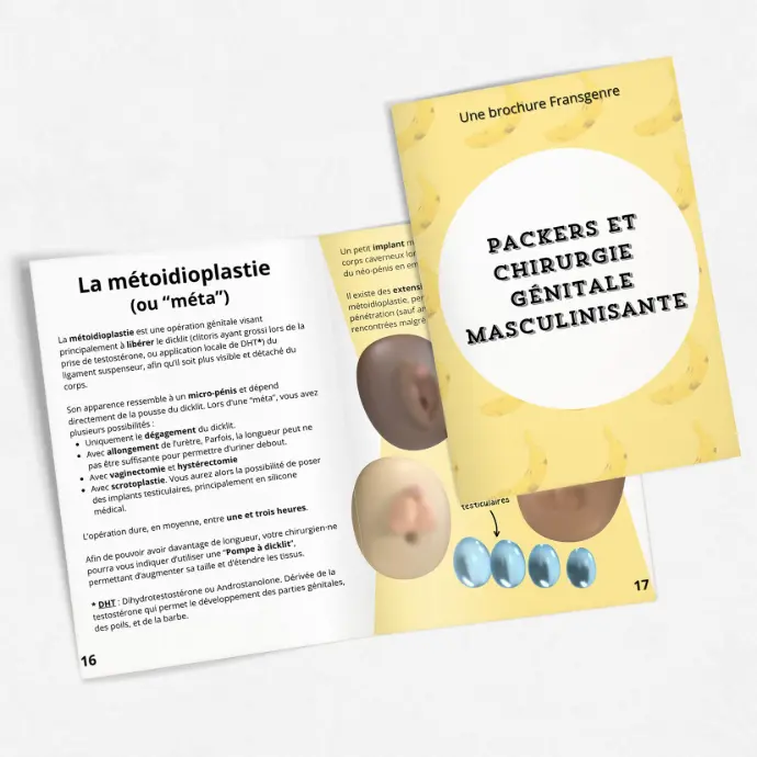 Dans cette brochure, nous parcourrons les diverses options (avec et sans chirurgie), à savoir : Les différents packers, l’hystérectomie, la métaïdoïoplastie, la phalloplastie, et tout ce qui va avec.